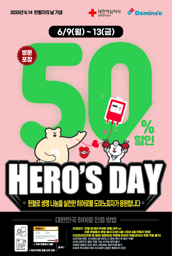도미노피자는 최근 1년 내 헌혈에 참여한 이들이 헌혈 내역을 증빙하면, 일부 포장 주문 피자 메뉴에 한해 최대 50% 할인 혜택을 제공하는 이벤트를 진행 중이다. 헌혈이라는 사회적 가치와 연계한 브랜드 마케팅 전략으로 젊은 세대의 자발적 참여를 끌어내기 위한 시도다.