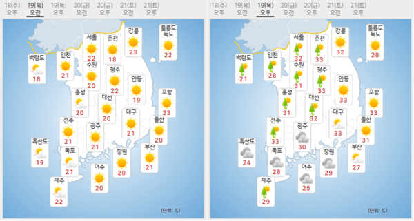 [이코리아] 19일 목요일은 낮 기온이 최고 33도까지 오르며 무더위가 기승을 부리다가, 전국이 차차 흐려지며 곳곳에 비가 내리겠다.